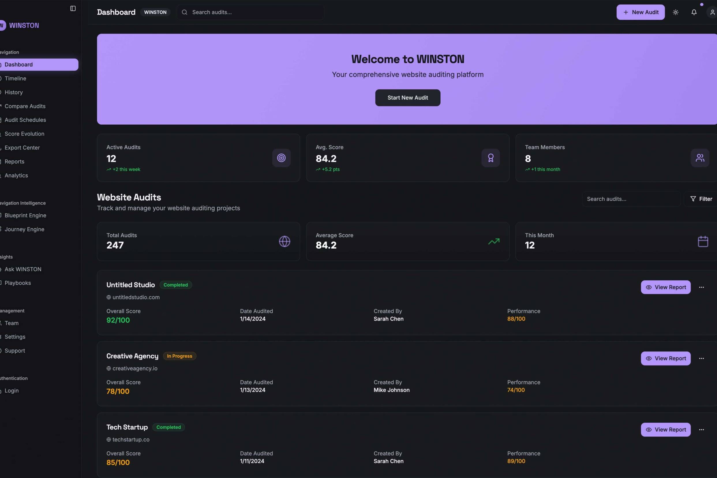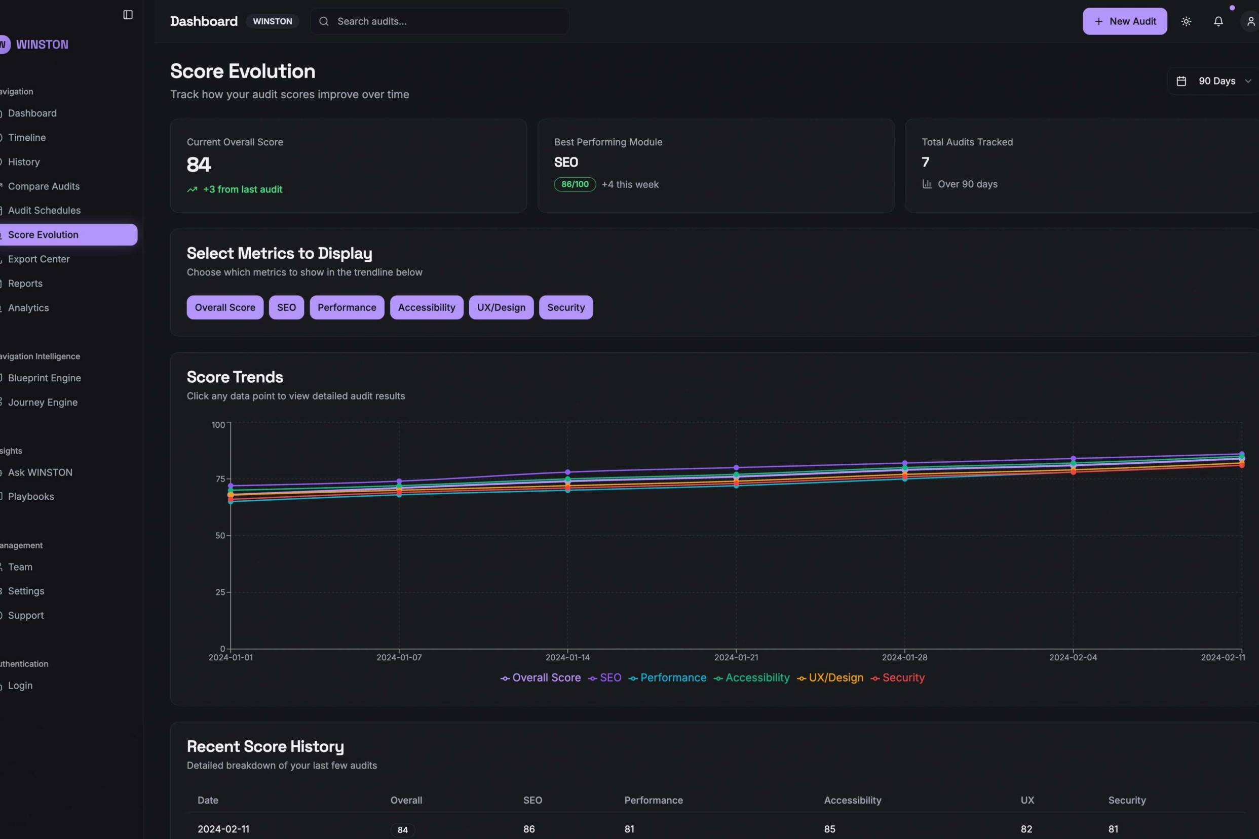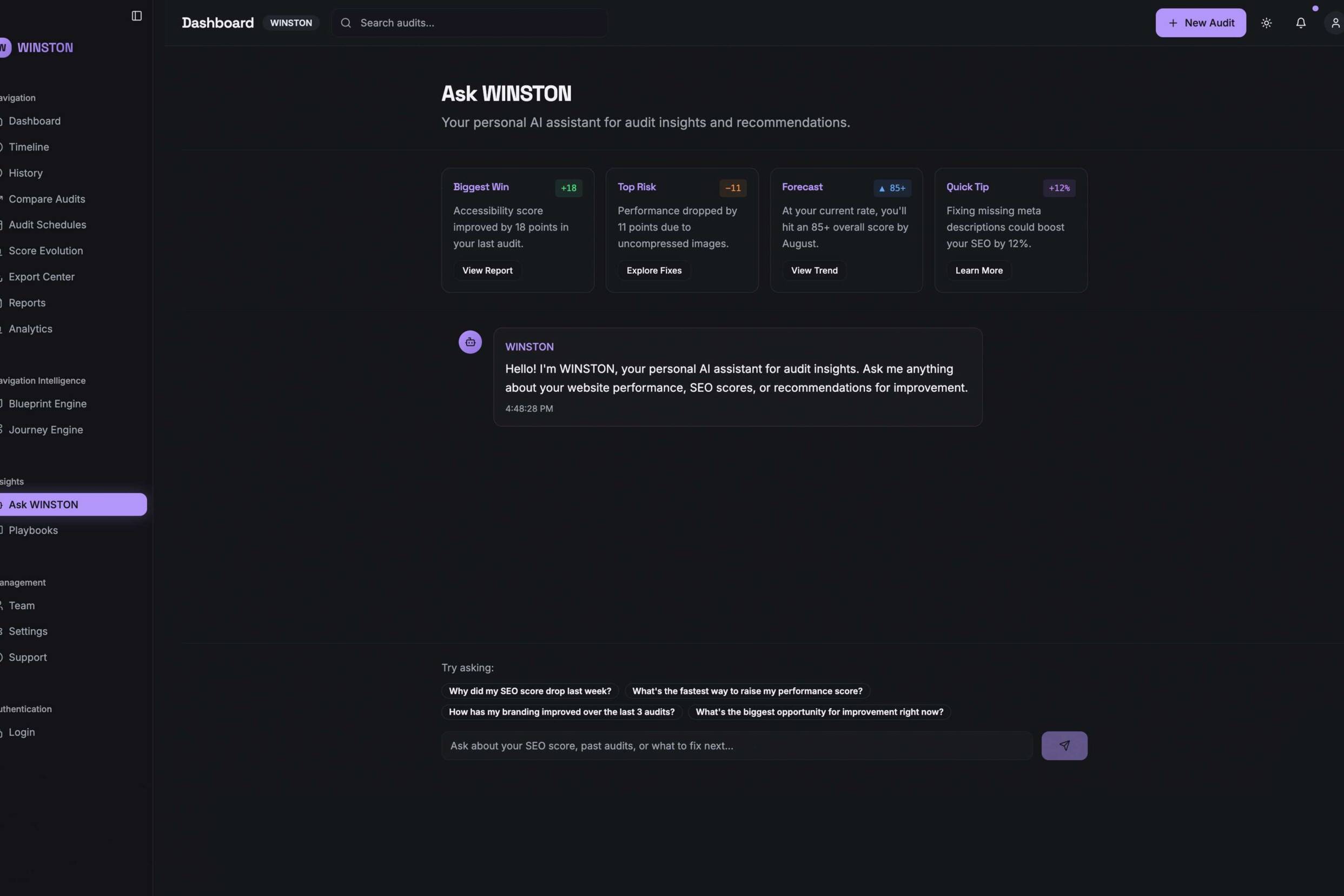 WINSTON reviews your site using smart tools, but every audit is human-reviewed to cut through the noise and highlight what matters most.