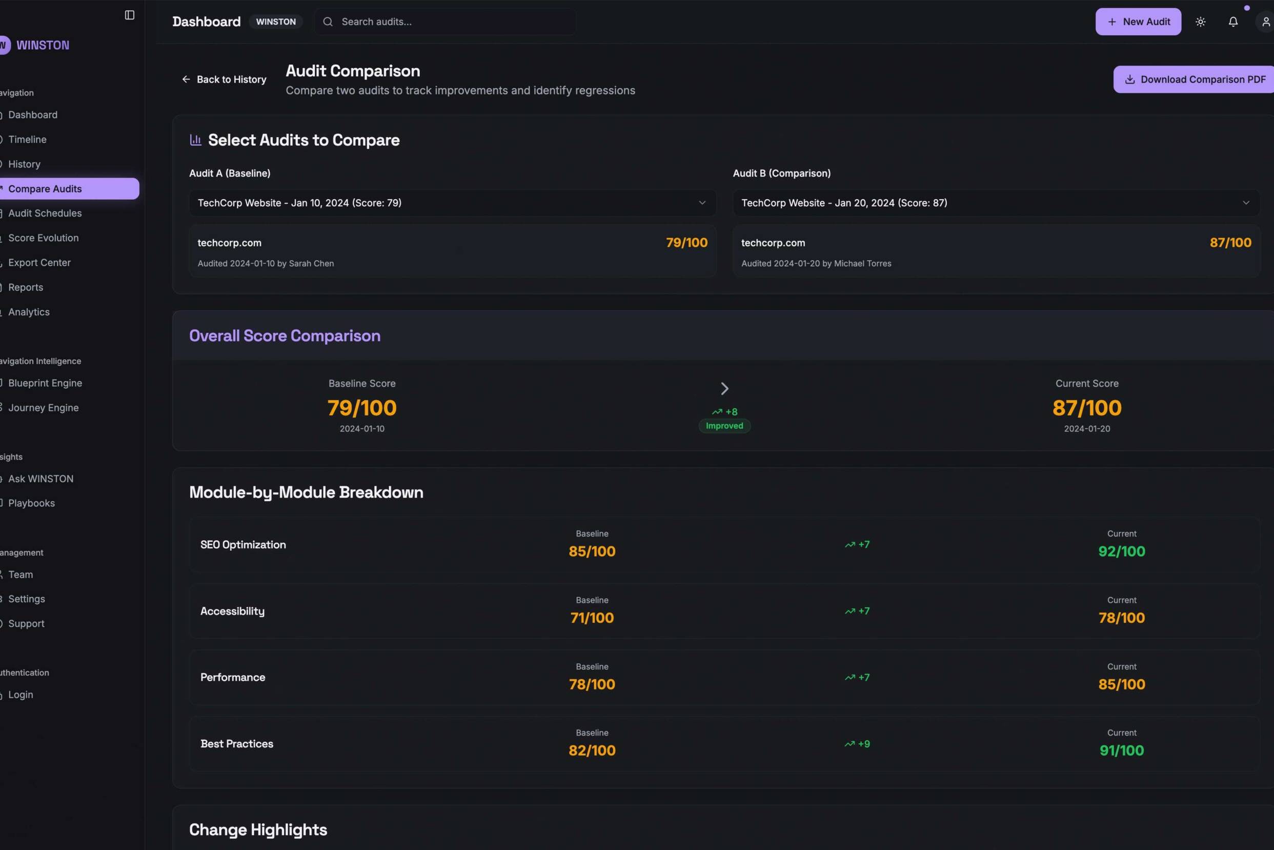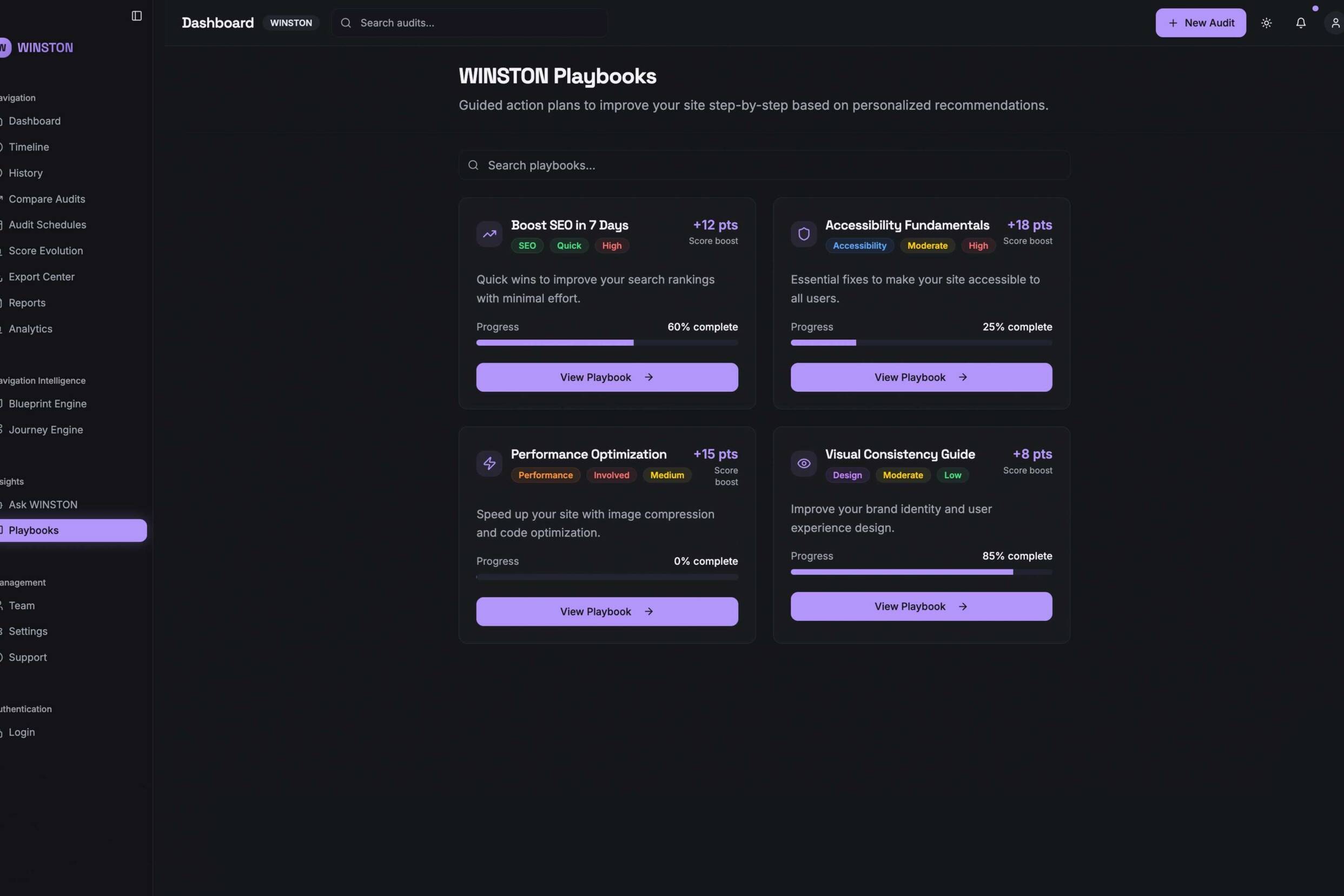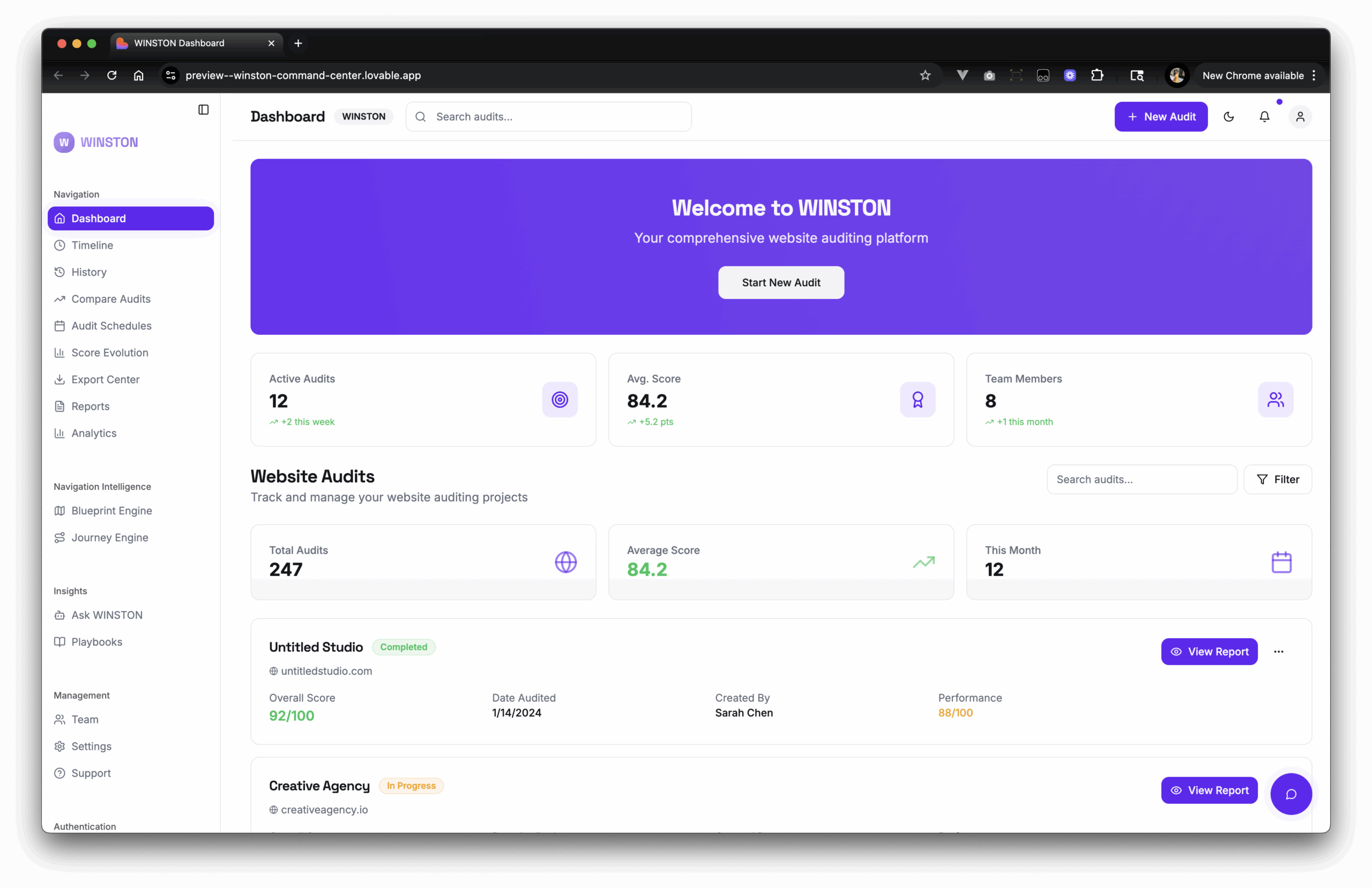 WINSTON reviews your site using smart tools, but every audit is human-reviewed to cut through the noise and highlight what matters most.